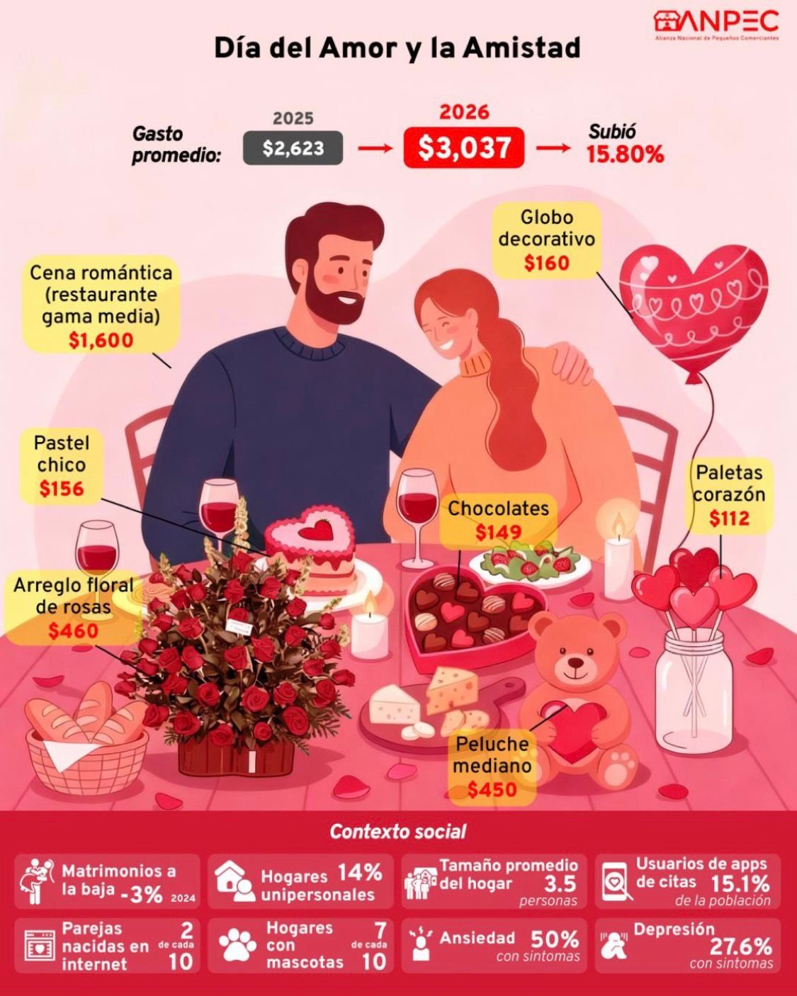 De acuerdo a la Alianza Nacional de Pequeños Comerciantes, se prevé un 14 de febrero más caro durante 2026. En ese sentido, el costo de celebrar el Día del Amor y la Amistad incrementará un 15.80%, esto si se hace una comparativa con 2025. Para realizar el cálculo, se hizo un sondeo de precios que incluyeron artículos que con frecuencia, se adquieren durante esta celebración.